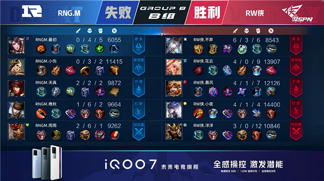 开局双方平稳开局。1分12秒RW侠拿下中路河道之灵。1分35秒RW侠野区击杀廉颇拿到一血。2分21秒RW侠上路击杀廉颇,RW侠下路击杀大乔。2分53秒RW侠拿下暴君。3分38秒野区团战RW侠打出1换4。5分17秒RW侠击杀虞姬并摧毁下路外塔。5分36秒团战RW侠打出0换2并摧毁中路外塔。6分12秒RW侠拿下主宰。6分26秒RW侠摧毁敌方上路外塔。7分32秒双方上路1换1。8分16秒中路团战RW侠击杀廉颇。8分40秒RW侠下路击杀赵云。9分38秒RW侠摧毁敌方上路二塔。10分09秒RW侠摧毁敌方中路二塔。10分23秒RW侠野区击杀赵云。10分55秒RW侠拿下暗影主宰。11分14秒RNG.M摧毁敌方下路外塔。11分53秒RW侠摧毁敌方下路二塔。12分15秒双方中路1换1。12分48秒RW侠下路打出0换2。14分35秒RW侠拿下暗影暴君。15分44秒RW侠拿下暗影主宰。16分22秒上路团战RW侠打出0换3。16分47秒RW侠摧毁敌方水晶拿下比赛。