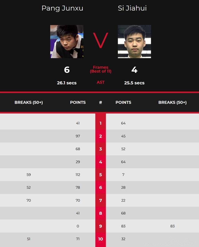 两人在首局耗时将近1个小时,打得比较拖沓,斯佳辉63-41险胜,之后的三局,两人也都未能打出单杆50+,比赛过程并不精彩,2-2在上半场战平。