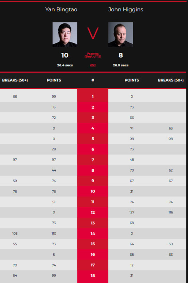 第15局,颜丙涛上手一杆55分,希金斯拿下50分用最后一颗红球做防守。希金斯长台打进后,清彩到蓝色球时失误。颜丙涛打进最后三颗彩球,以73-64获胜8-7反超。第16局,希金斯打出一杆63分,以68-5获胜追至8-8。