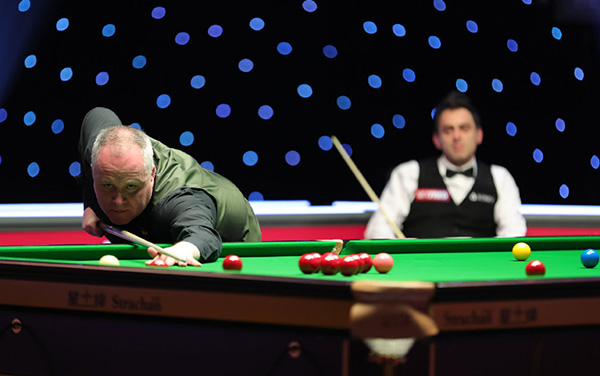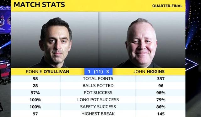 休息回来后,奥沙利文稳住局面,第五局,希金斯沉底留下机会,奥沙利文大角球红球上手,奥沙利文克服静电的影响,单杆125分清台。第六局,希金斯单杆30分,架杆红球不进,留下机会;奥沙利文单杆103分清台拿下。奥沙利文3-3追平。