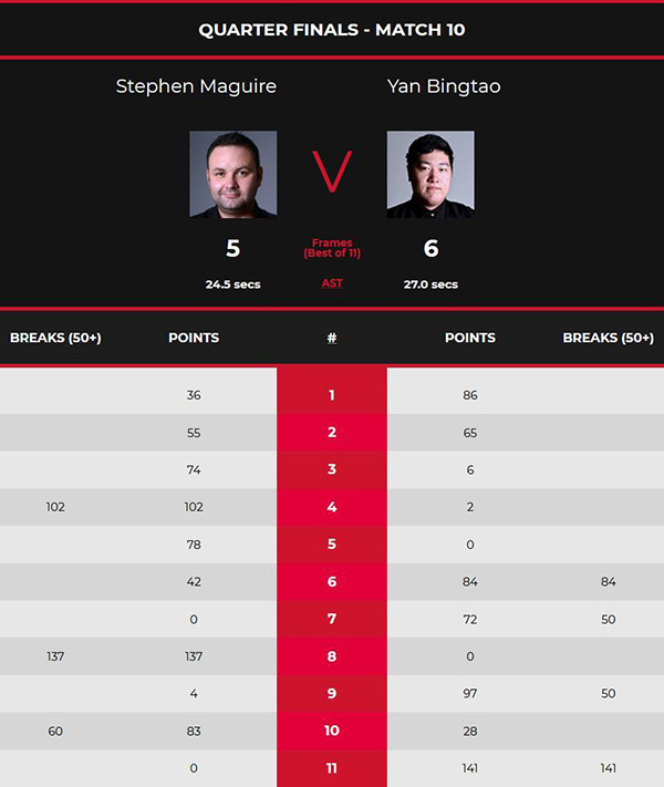 决胜局中,马奎尔仍旧是选择拼长台进攻,没能打进底袋红球后漏出中袋机会,压力下颜丙涛展现了强大的心理素质,推进红球后开始上手围球,随后这杆进攻颜丙涛打出单杆141分制胜,再度刷新了赛会单杆最高分。颜丙涛6-5绝杀马奎尔,生涯首进大师赛四强,下轮对手是宾汉姆。