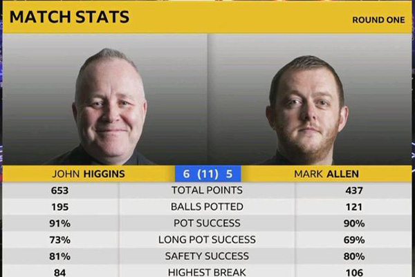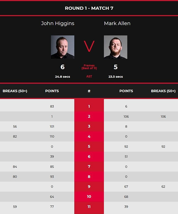 下半场第五局,艾伦找回手感,打出一杆92分零封。第六局,双方一番防守拉锯战,艾伦成功清台,以51-39取胜再追一局,双方战至3-3。第七局,希金斯单杆84分,以85-0拿下。第八局,希金斯抓住机会,远台上手,单杆80分拿下。希金斯5-3赛点。