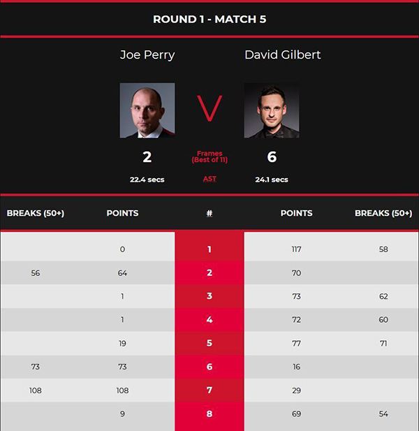 第7局中,吉尔伯特这局仍旧有机会终结比赛,率先上手围球中断在29分,此后吉尔伯特一杆安全球出现严重失误母球撞散球堆,乔佩里此后围球打出单杆108分破百清台,再救赛点2-5落后。第8局中乔佩里连得8分后架杆失误,随后吉尔伯特两度上手69-8取得超分优势,乔佩里拼进红球后粉球不进,被超分较多放弃了这局。最终吉尔伯特6-2战胜乔佩里,挺进大师赛八强,接下来将对阵威尔逊。
