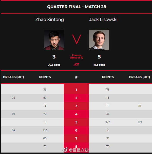 1/4决赛,他的对手是90后后天才利索夫斯基,本场比赛,赵心童在前两局与对手打成1-1。