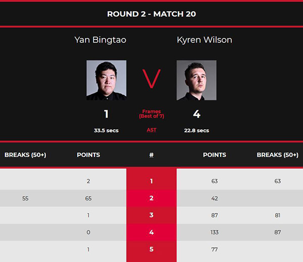第三局,威尔逊抓住机会单杆81分,以87-1拿下。第四局,威尔逊单杆46分,威尔逊翻袋上手单杆87分。威尔逊3-1赛点。第五局,威尔逊1分防守,颜丙涛两次没有解到,威尔逊长台上手单杆49分,颜丙涛1分没有校到彩球,防守比拼,威尔逊抓住机会单杆19分以77-1拿下。