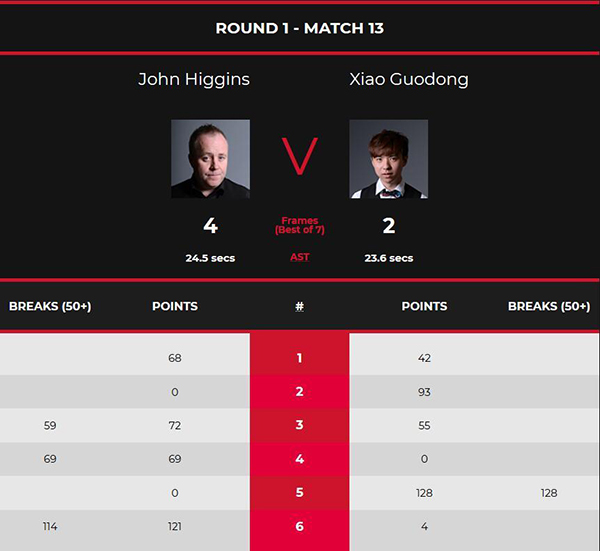 本场比赛第一局,在胶着比赛中,希金斯以68-42胜出,1-0领先。第二局,肖国栋通过几次上手,还是以93-0零封希金斯,1-1扳平比分。