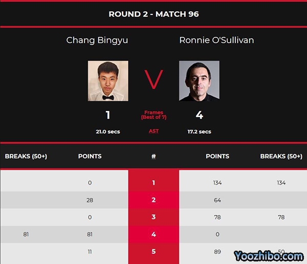 第三局,奥沙利文单杆78分拿下。奥沙利文3-0领先。第四局,常冰玉单杆81分追回一局。第五局,奥沙利文单杆54分,奥沙利文长台不进留下机会,常冰玉单杆11分,防守比拼,常冰玉留下机会,奥沙利文单杆35分拿下比赛。