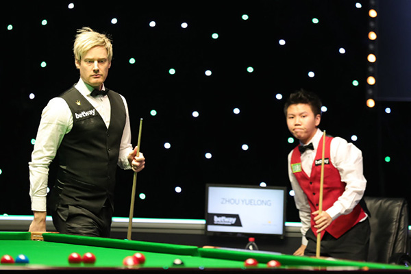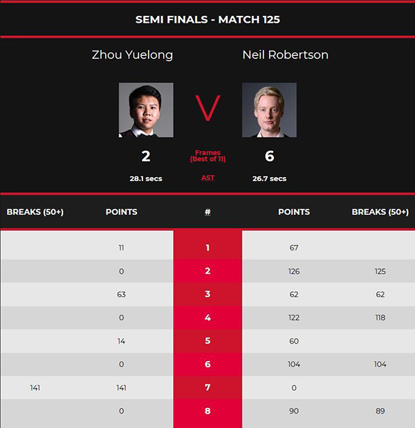 下半场第五局,罗伯逊先得23分后防守,周跃龙进攻未果再送机会,罗伯逊攻下33分56-0领先,台面上还剩四颗红球。周跃龙拿下14分后犯规,罗伯逊以60-14取胜4-1领先。第六局,罗伯逊打出本场个人第三杆破百,攻下104分零封,5-1直达赛点。
