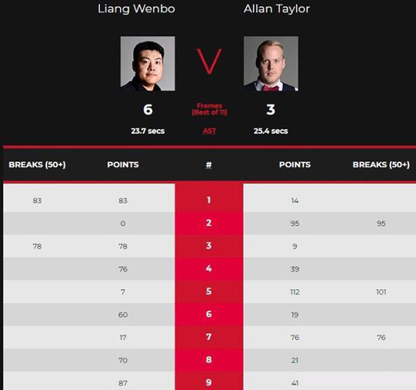 第一局,梁文博入局后,完成了一杆制胜,单杆83分、83-14先下一城,大分1-0。第二局,梁文博几乎没有上手机会,泰勒则抓住了机会,同样是一杆制胜,单杆95分零封梁文博,将比分1-1扳平。第三局,梁文博还以颜色,单杆78分、78-9,再次将大分2-1领先。第四局,梁文博占据上风,泰勒也是紧追,梁文博最后连续打进彩球锁定胜局,泰勒选择放弃。中场过后,梁文博3-1领先。
