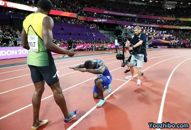 在博尔特的退役战上,他输给了加特林,当博尔特、加特林冲过终点后,一时之间还不知道是谁获得了冠军。当显示屏出现加特林以9秒92的成绩夺冠的时候,加特林对博尔特做出了“帝王拜”的动作,这是加特林对博尔特历史地位的认可,博尔特就是短跑项目的帝王。自己作为挑战者,终于在伦敦世锦赛击败了这位短跑皇帝。