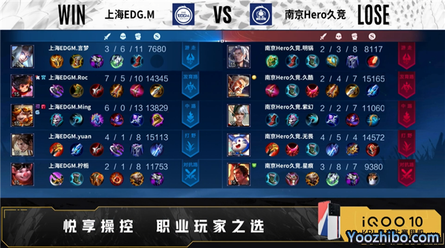 开局双方正常抢线。45秒野区上海EDG.M击杀梦奇,拿下一血。2分09秒上海EDG.M拿下暴君,野区击杀吕布,打出0换1。4分17秒上海EDG.M拿下主宰,崔康乐击杀吕布,双方打出1换1。5分42秒对抗路上海EDG.M击杀梦奇,双方打出1换1,发育路河道南京Hero久竞击杀猪八戒,中路上海EDG.M击杀鲁班大师,摧毁敌方对抗路外塔、发育路外塔,拿下暴君。8分13秒发育路南京Hero久竞击杀李元芳,野区上海EDG.M击杀吕布,双方打出1换1,上海EDG.M拿下主宰。9分22秒中路上海EDG.M击杀鲁班大师,李元芳二连击破,打出2换4,拿下暗影主宰。11分26秒野区上海EDG.M击杀黄忠,打出1换3,摧毁敌方中路外塔、二塔、高地。13分24秒上海EDG.M摧毁敌方对抗路二塔。14分06秒野区上海EDG.M击杀吕布,南京Hero久竞击杀东皇太一,打出2换3,拿下暗影主宰,摧毁敌方中路外塔。15分33秒野区上海EDG.M击杀梦奇,打出0换1。16分46秒野区上海EDG.M击杀黄忠,双方射手互换,上海EDG.M拿下暗影暴君。18分39秒野区南京Hero久竞击杀李元芳,拿下暗影主宰。19分24秒南京Hero久竞摧毁敌方对抗路二塔,击杀东皇太一,打出1换1。20分36秒野区上海EDG.M击杀黄忠,打出0换4,摧毁水晶拿下比赛。