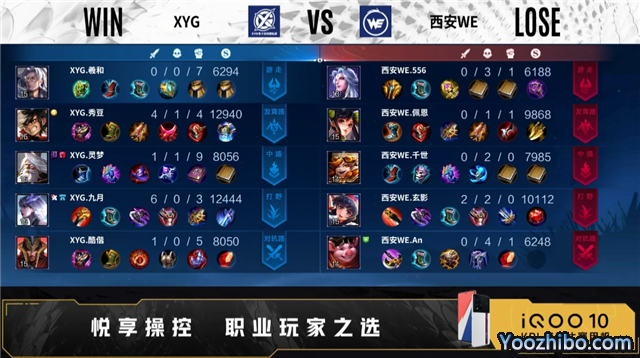 开局双方正常抢线。47秒野区XYG击杀铠,拿下一血。2分12秒XYG拿下主宰,西安WE拿下暴君。3分09秒野区XYG击杀王昭君,打出0换2。4分11秒对抗路XYG击杀关羽,摧毁敌方对抗路外塔。5分09秒中路XYG宫本武藏二连击破,摧毁敌方中路外塔、发育路外塔。6分30秒XYG拿下主宰,8分14秒XYG拿下暴君。8分35秒野区XYG击杀关羽,打出0换2,摧毁敌方中路二塔。9分08秒对抗路XYG击杀马可波罗,打出1换2,摧毁敌方对抗路二塔、发育路二塔。10分05秒西安WE摧毁敌方对抗路外塔,XYG拿下暗影主宰。11分15秒XYG摧毁敌方发育路高地、中路高地。12分25秒XYG拿下暗影暴君。12分53秒高地XYG击杀马可波罗,摧毁敌方对抗路高地,打出0换4,摧毁水晶拿下比赛。