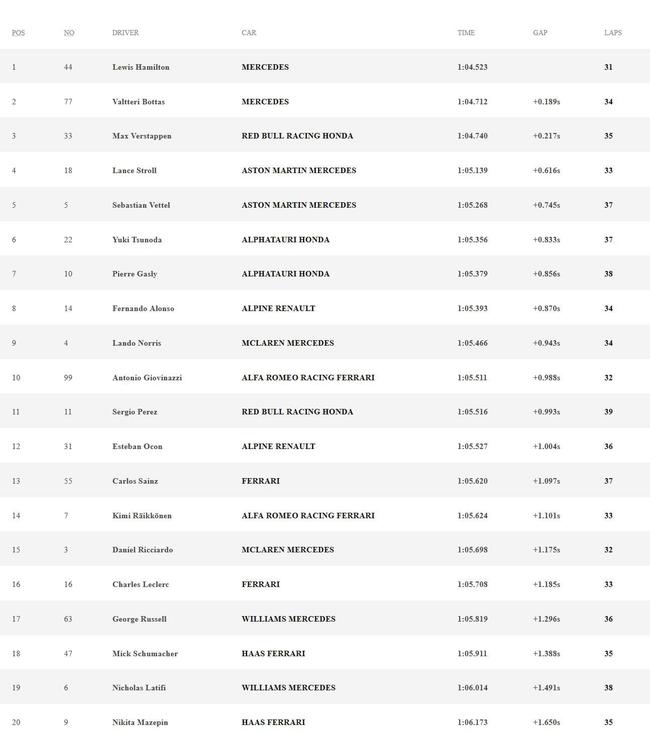 不过,二练中,梅奔表现强势,汉密尔顿和博塔斯包揽前二,维斯塔潘排在第三。而且这个成绩是在同样的赛道、同样的轮胎、同样的条件下完成的。所以,周末可能会上演一场真正的厮杀了。