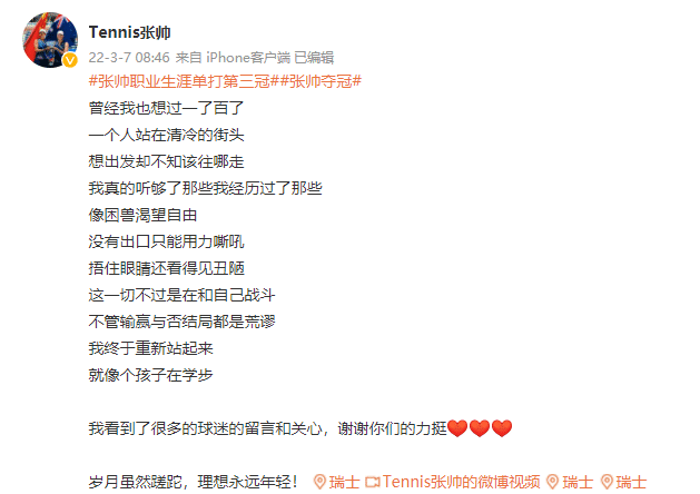 JRS直播网03月07日讯 ,WTA巡回赛里昂站结束了决赛争夺。中国金花张帅面临顶住场内外的巨大压力,2-1逆转击败乌克兰选手雅斯特雷姆斯卡,时隔5年再夺WTA巡回赛冠军,也是生涯首次在海外夺冠。而张帅也通过社交媒体分享了自己夺冠的心情,张帅表示:“岁月虽然蹉跎,理想永远年轻!”