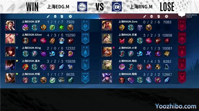 开局上海EDG.M上中换线,52秒野区吕布击杀橘右京拿下一血。2分04秒中路团战rng1换2。2分29秒野区上海RNG.M2换1,发育路射手互换血量,孙尚香被击杀。3分50秒上海EDG.M越塔追击,东皇太一被反杀。4分20秒上海RNG.M拿下暴君。5分01秒对抗路上海RNG.M打出1换2,5分23秒Roc中路二连击破,摧毁敌方中路外塔。6分18秒上海EDG.M击杀不知火舞。7分03秒上海EDG.M摧毁敌方发育路外塔,上海RNG.M摧毁敌方对抗路二塔,团战打出一波3换0。8分28秒上海EDG.M拿下主宰。9分43秒发育路上海EDG.M击杀不知火舞,野区上海RNG.M击杀赵云,双方打出一波1换1。10分36秒暗影暴君处团战上海RNG.M打出2换3。11分42秒上海EDG.M拿下暗影主宰,暗影暴君处团战上海RNG.M打出3换2,对抗路二塔被兵线摧毁。13分03秒上海EDG.M拿下暗影暴君。13分57秒中路上海EDG.M击杀张飞,发育路越塔击杀不知火舞,摧毁敌方发育路二塔。16分18秒上海EDG.M拿下暗影主宰,Roc四连超凡团灭对手,1换5摧毁水晶拿下比赛。