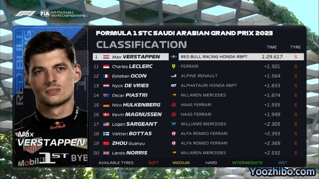 第四名之后的车手落后维斯塔潘的差距都达到了1秒以上。五六位是两位梅赛德斯车手拉塞尔和汉密尔顿,塞恩斯第七,加斯利第八,阿尔本和角田裕毅分别排在第九和第十。勒克莱尔位列第11位。