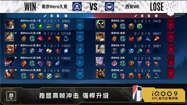 第一局双方常规开局。1分42秒南京Hero久竞野区击杀大乔拿下一血。2分12秒西安WE拿下暴君。3分16秒南京Hero久竞拿下先知主宰。3分32秒西安WE中路击杀宫本武藏。4分钟双方发育路1换1。5分12秒南京Hero久竞摧毁敌方对抗路外塔。5分55秒西安WE对抗路击杀宫本武藏,随后摧毁敌方对抗路外塔。6分49秒西安WE摧毁敌方发育路外塔,随后拿下暴君。7分钟发育路团南京Hero久竞打出1换3,吕布拿下三连决胜。8分35秒西安WE拿下主宰。10分06秒双方互换边路二塔。10分13秒南京Hero久竞拿下暗影主宰。11分钟野区团西安WE打出0换2。11分44秒西安WE拿下暗影暴君。12分55秒双方互换边路二塔。14分钟野区团南京Hero久竞打出0换2。14分31秒南京Hero久竞拿下暗影主宰。15分钟南京Hero久竞摧毁敌方中路二塔。15分37秒南京Hero久竞拿下暗影暴君。16分20秒对抗路团南京Hero久竞打出1换2,随后摧毁敌方对抗路高地塔。17分37秒野区团西安WE打出1换2。18分09秒西安WE摧毁敌方中路外塔。18分32秒西安WE拿下暗影主宰。20分07秒西安WE对抗路击杀吕布。20分39秒西安WE拿下风暴龙王。21分53秒西安WE摧毁敌方对抗路高地塔。22分20秒发育路团西安WE打出1换5团灭对手。22分41秒西安WE摧毁敌方水晶拿下比赛。