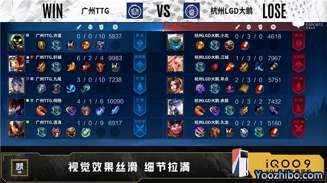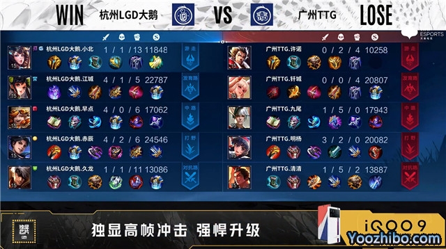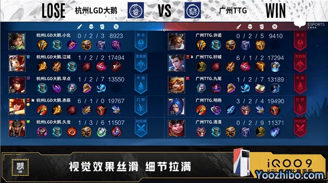 双方常规开局。2分13秒杭州LGD大鹅拿下暴君。2分47秒广州TTG中路击杀不知火舞。4分10秒广州TTG发育路击杀盾山。4分23秒野区团战广州TTG打出1换2。4分50秒双方发育路1换1。5分30秒杭州LGD大鹅发育路击杀鲁班七号。6分42秒广州TTG野区击杀公孙离。7分09秒广州TTG野区击杀盾山。8分52秒野区团战广州TTG打出0换2。10分40秒广州TTG摧毁敌方中路二塔。10分58秒广州TTG摧毁敌方对抗路二塔。11分31秒高地团战广州TTG打出0换4。12分整广州TTG团灭对手摧毁水晶拿下比赛。