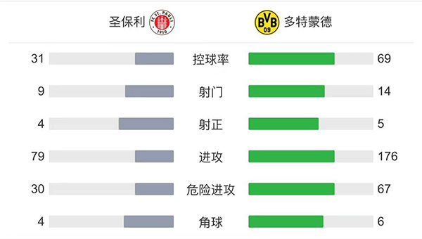 第4分钟,圣保利进球!右路哈特尔禁区内背身拿球后倒三角给到中路阿门伊多,后者顺势打门得手,圣保利1-0多特。