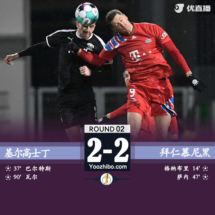 第90+3补时最后一秒,基尔发动最后一波进攻,左路挑传球到禁区,瓦尔甩头攻门顶入死角,基尔2-2拜仁!