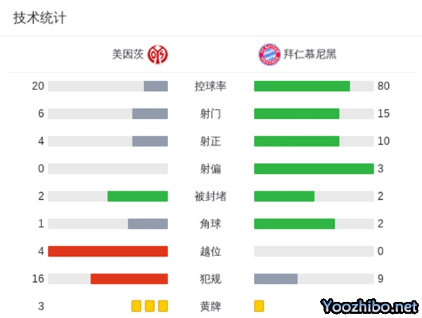 全场比赛结束,拜仁慕尼黑4-0美因茨!