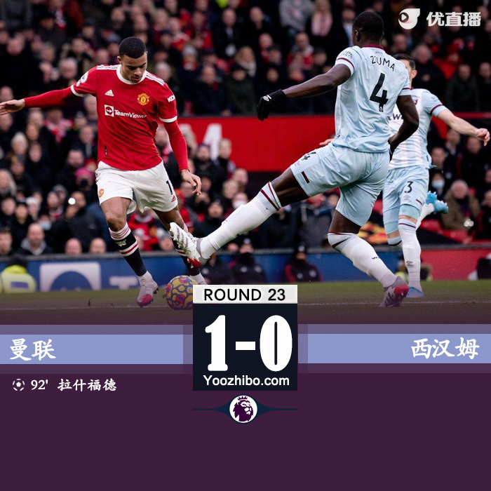 JRS直播网1月23日讯 北京时间1月22日23:00,英超联赛第23轮曼联主场对阵西汉姆联的比赛,上半场双方威胁机会寥寥,半场结束,曼联0-0西汉姆。下半场拉什福德替补上场读秒绝杀,曼联1-0西汉姆。