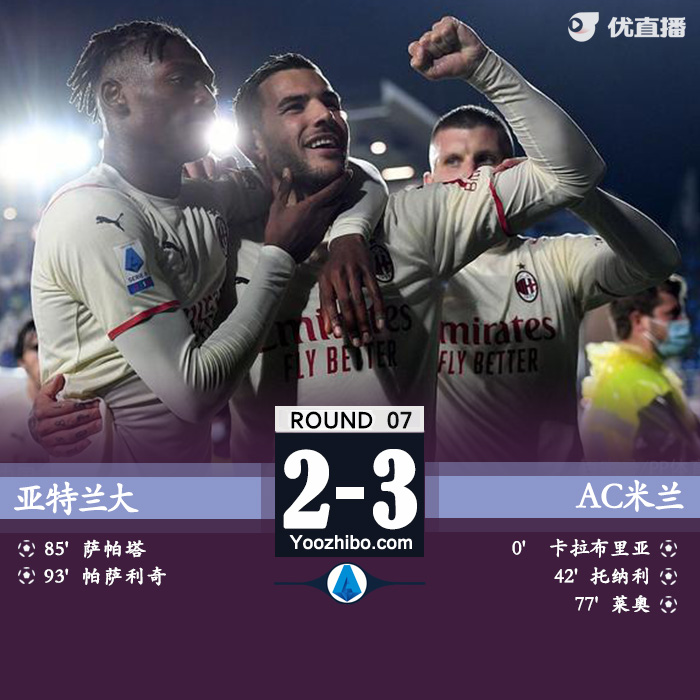 JRS直播网10月4日讯 北京时间10月04日星期一02:45,意甲第7轮亚特兰大对阵AC米兰。上半场,卡拉布里亚开场28秒超级闪击,托纳利破门,迈尼昂频频救险,AC米兰半场2-0领先亚特兰大。下半场,特奥奔袭助攻,莱奥破门,梅西亚斯手球被判罚点球,萨帕塔点射扳回一城,帕萨利奇补时再入一球。最终,AC米兰客场3-2战胜亚特兰大,红黑军团升至联赛第二。