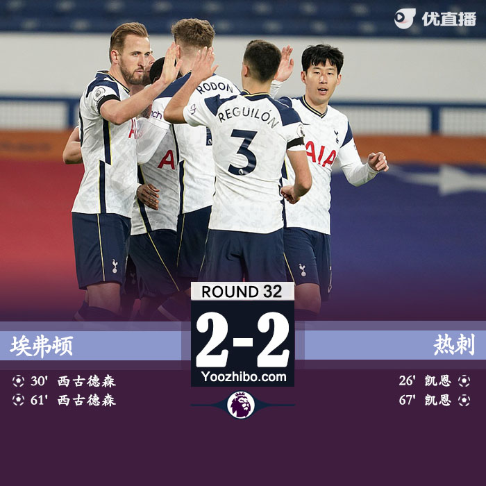 JRS直播网4月17日讯 北京时间4月17日凌晨3点整,2020-21赛季英超32轮焦点战在古迪逊公园球场展开角逐,埃弗顿坐镇主场迎战热刺。上半场凯恩首开纪录,雷吉隆送点,西古德森点射扳平,下半场西古德森反超比分,凯恩再入一球后伤退。最终热刺客场2-2战平埃弗顿,热刺联赛连续三轮不胜,埃弗顿五轮不胜。积分榜方面,热刺积50分距前四5分,埃弗顿积49分位列第8名。