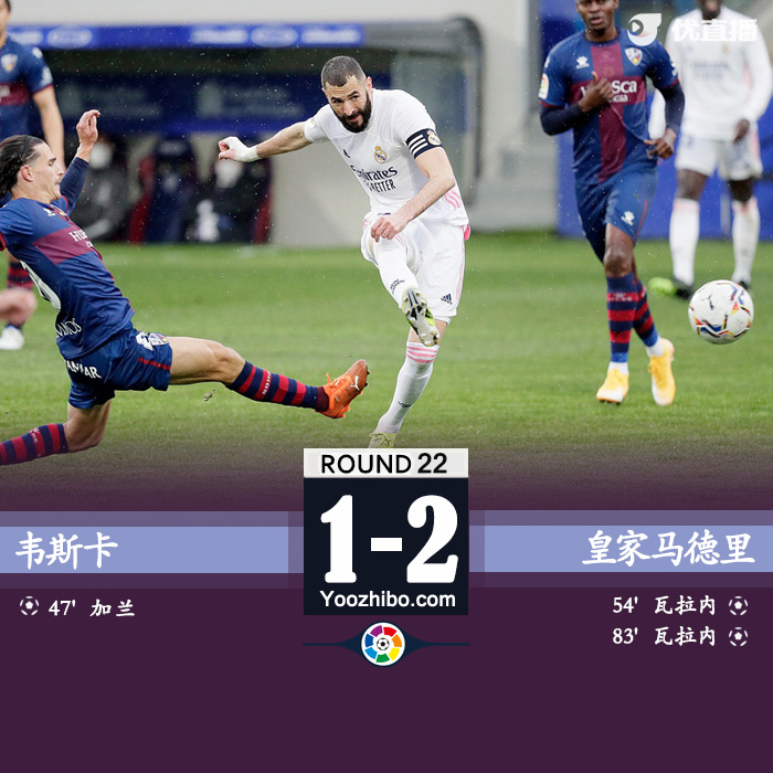 JRS直播网2月7日讯 北京时间2月6日晚23点15分,2020-21赛季西甲第22轮在阿尔科拉斯球场展开角逐,皇家马德里客场挑战韦斯卡。上半场维尼修斯失良机,下半场加兰世界波,瓦拉内梅开二度,奥德里奥索拉伤退。最终皇家马德里客场2-1逆转战胜韦斯卡,积分榜方面,皇马积43分距榜首7分。