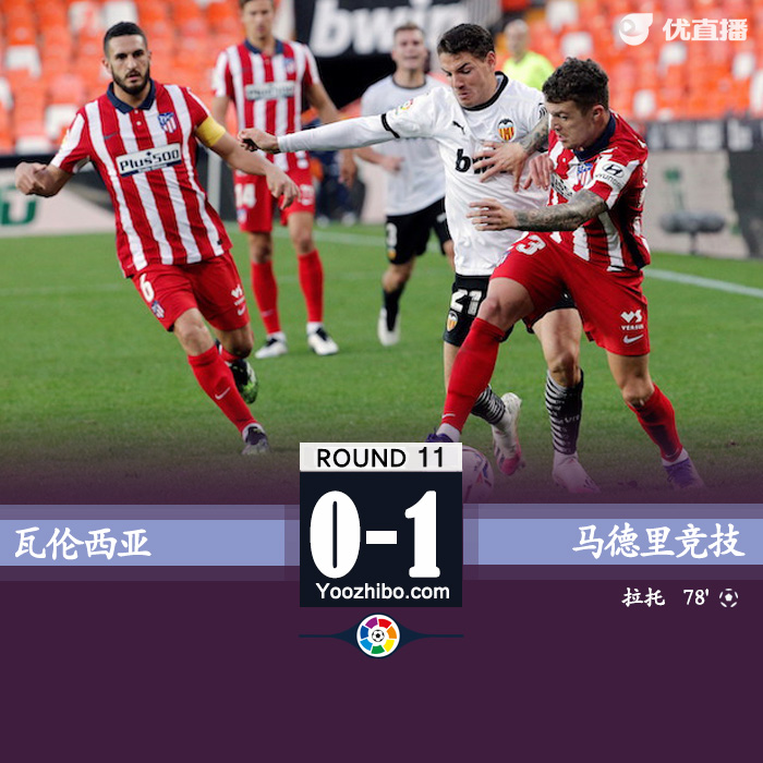 JRS直播网讯:北京时间11月28日23:15分进行西甲联赛第11轮,瓦伦西亚主场对阵马德里竞技。上半场比赛,勒马尔两脚高质量射门都被多梅内克飞身扑出,奥布拉克扑出拉契奇近距离的推射以及勒马尔的解围。下半场比赛,卡拉斯科传中造成拉托乌龙。全场比赛结束,马竞1-0战胜瓦伦西亚,取得联赛六连胜,少赛一轮的情况下23分追平联赛头名皇家社会,排名联赛第2。