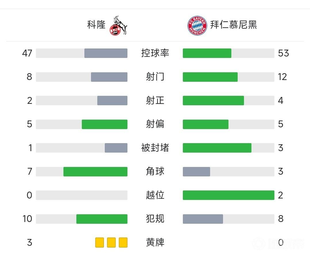 关键事件: 第8分钟,萨内长距离横向盘带,随后分球左路,科曼得球内切,接着右脚爆射得手,拜仁1-0科隆。