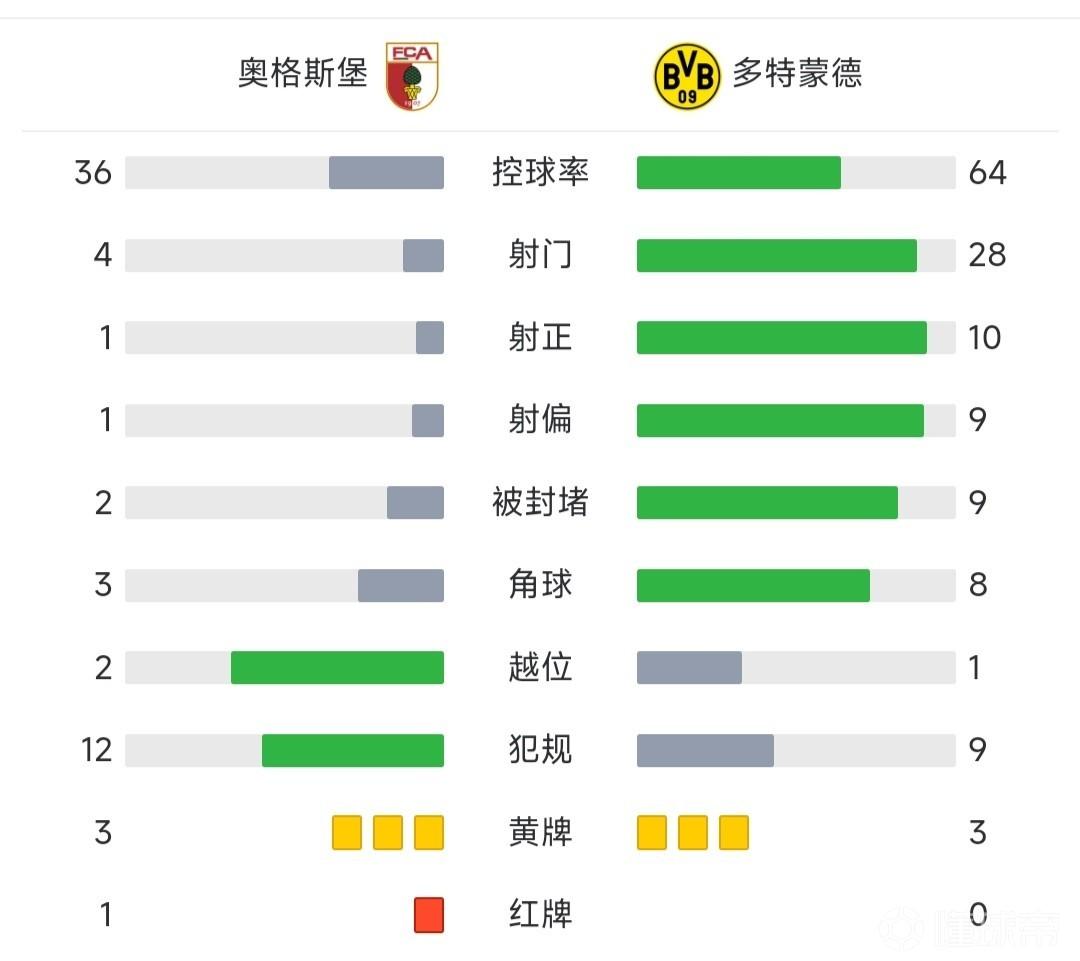 最终多特蒙德客场3-0完胜奥格斯堡。
