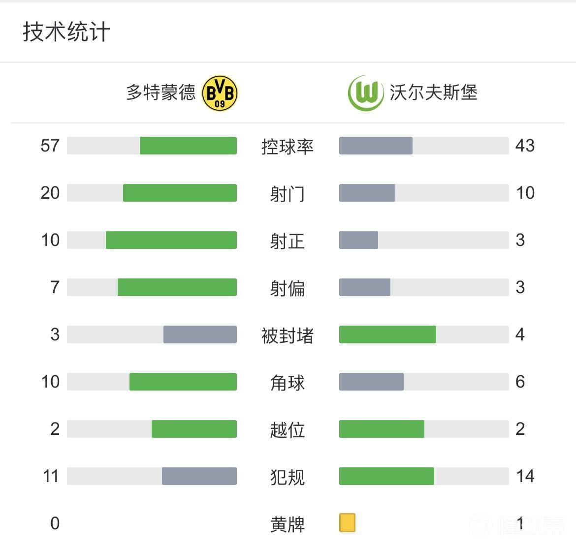 全场比赛结束,多特蒙德6-0沃尔夫斯堡。