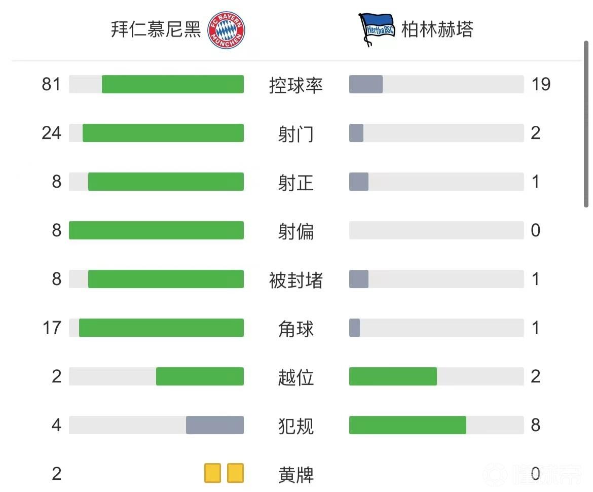 全场比赛结束,拜仁慕尼黑2-0柏林赫塔。
