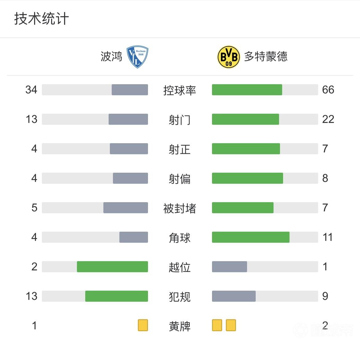 全场比赛结束,多特蒙德1-1波鸿,先赛1轮领先拜仁2分!