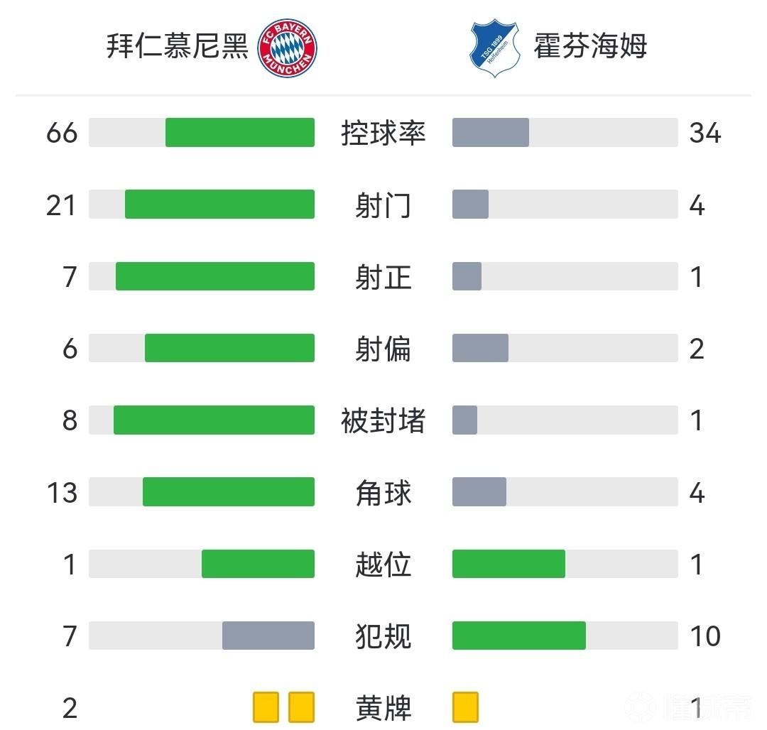 最终,拜仁主场1-1战平霍芬海姆,仍然以两分优势领跑积分榜。