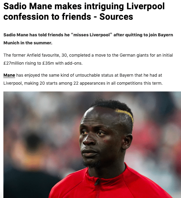 JRS直播网11月08日晚,来自英国媒体ootball Insider的消息,效力于拜仁的巨星马内,已经在私下告诉自己的好友,自己非常想念老东家利物浦还有想念英超联赛。