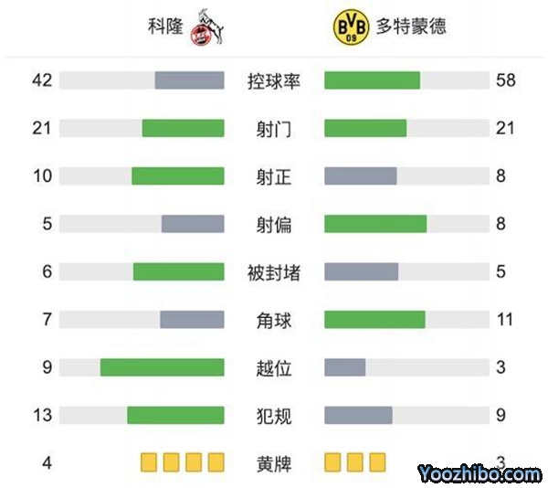 第53分钟,科隆扳平比分,多特右路防线出现空当,马伊纳下底传中,凯因茨中路包抄捅射破门,科隆1-1多特。