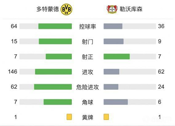 全场比赛结束,多特蒙德2-5勒沃库森。
