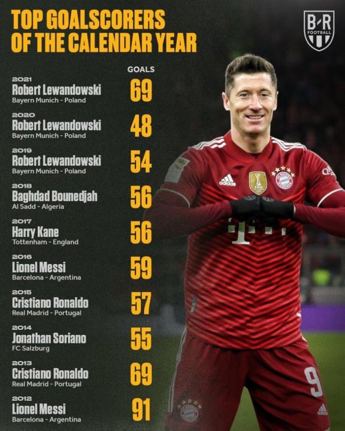 JRS直播网01月01日讯 露天看台盘点了过去10年的自然年射手王,莱万已经连续三年排名第一,而梅西和C罗则两次上榜。