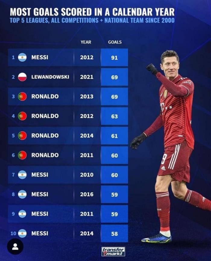 JRS直播网12月20日讯 消息,德国转会市场统计了2000年以来的五大联赛自然年进球纪录(所有俱乐部赛事和国家队比赛),梅西以91球居首。