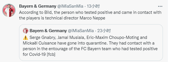 JRS直播网讯 11月22日《图片报》消息,包括格纳布里和聚勒在内的多名拜仁球员因为新冠和密切接触被隔离。