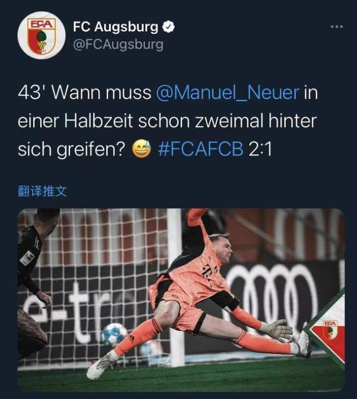 奥格斯堡官推写道:诺伊尔什么时候半场丢两球?奥格斯堡2-1拜仁。