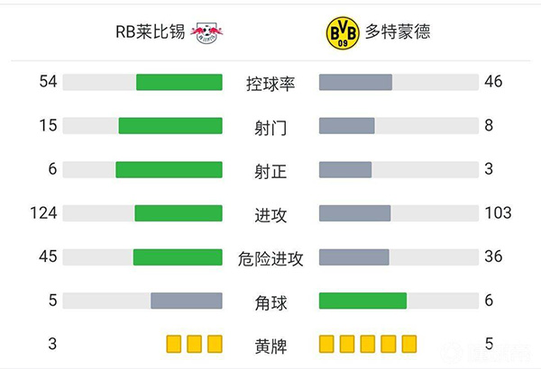 第52分钟,多特扳平比分!穆尼耶中路拿球斜传给前插的罗伊斯面对门将单刀打门球进。莱比锡1-1多特。