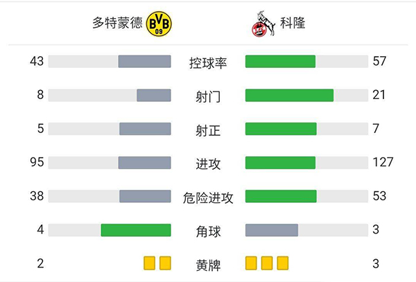 停补时3分钟。全场比赛结束,多特蒙德2-0科隆。