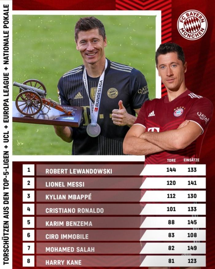如图,从2018年8月至今,五大联赛各项赛事总射手榜中,莱万位居榜首,莱万133场比赛打进144球,他的效率超过了场均1球。而排名第二的是梅西,他141场比赛打进120球。不过,这里没有计算梅西的助攻,18-19赛季梅西各项赛事助攻19次,19-20赛季助攻25次,上赛季助攻12次。如果算上助攻的话,梅西绝对是第一,他是制造进球最多的球员。