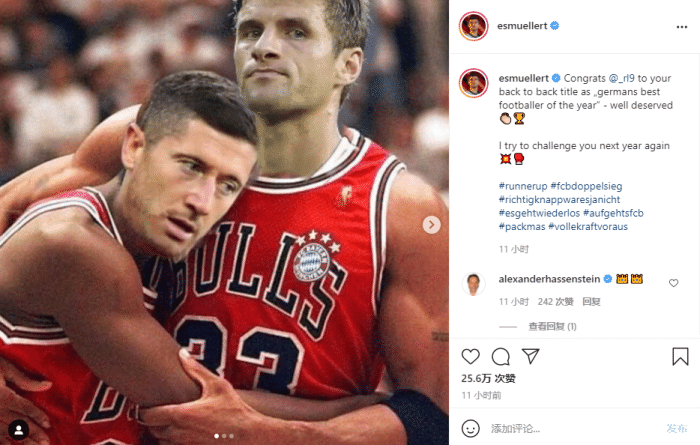 穆勒写道:“祝贺莱万连续两年当选德国足球先生,实至名归,明年我会再次尝试挑战你!”