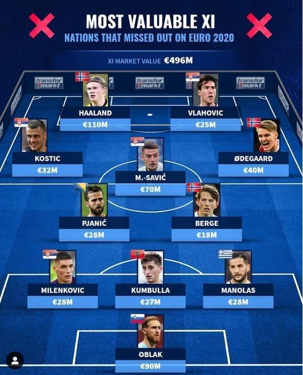 JRS直播网讯 , 德国转会市场列出了未能进入欧洲杯各国球员的最贵阵容,挪威前锋哈兰德以1.1亿居首,11人的总身价高达4.96亿欧。