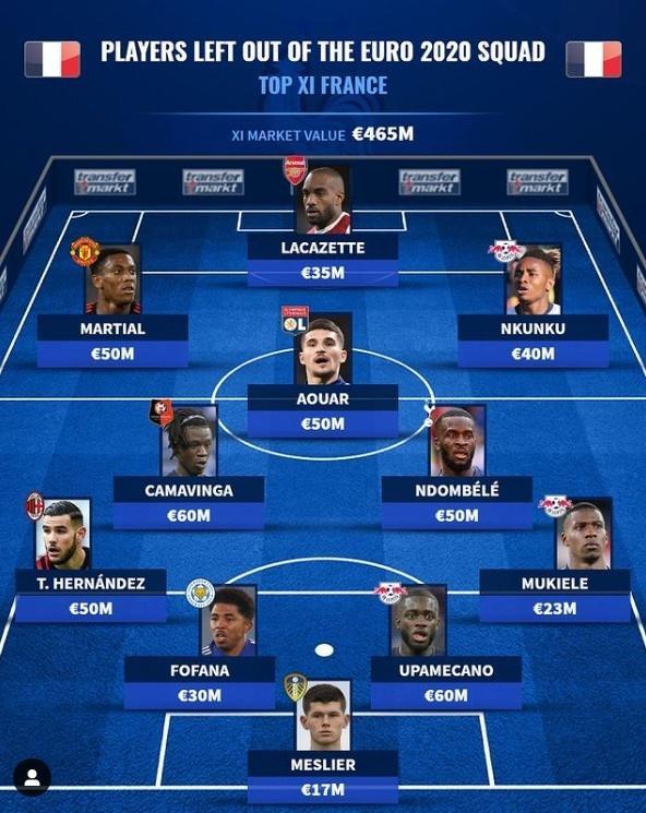 JRS直播网讯 北京时间5月21日,法国队公布了欧洲杯大名单,落选的球员可谓群星璀璨,德国转会市场评出了法国落选欧洲杯的最佳阵容,总身价高达4.65亿欧。