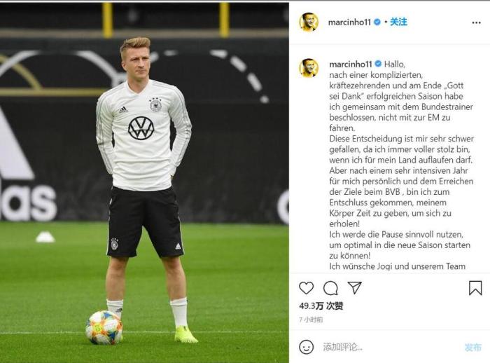 JRS直播网讯 北京时间5月19日,罗伊斯在个人社交媒体上宣布,自己不会参加今年夏天的欧洲杯。